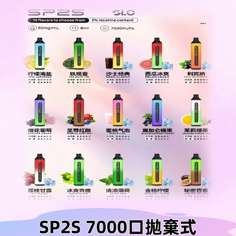 SP2S GLO 7000口一次性電子煙,配備8mL大容量煙油與600mAh電池,提供15種精緻口味,涵蓋水果、清涼、茶飲等,滿足多元需求。採用雙芯霧化技術,煙霧細膩,擊喉感純正,支援Type-C快充。